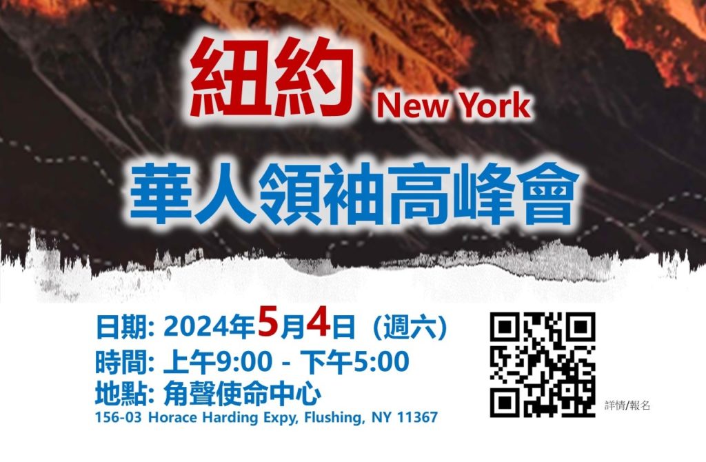 2024年5月美東華人領袖高峰會由基督教角聲佈道團策劃,華人美好生活協會(華美會/CBLA)籌辦,晨光福音會和新澤西華人浸信會協辦,將於5月4日在紐約角聲使命中心及5月18日在新澤西華人浸信會舉行,峰會主要語言為普通話。由於這是眾華人領袖難得一聚的盛會,角聲特別組成專門籌備小組,經過兩個多月的磋商,大會各項安排已基本完成,華美會也為此設立資訊網頁及報名系統,讓參加者可以享受現代科技帶來的創新與便利。登入https://cblausa.org/ 即可瞭解詳情及報名,個人報名費$80包括大會手冊、午餐及茶點,集體報名可獲優惠,鼓勵教牧長執率領青年領袖一同參加。