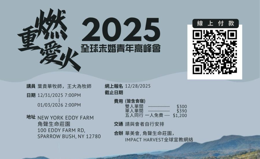 2025全球未婚青年高峰會 2025全球未婚青年高峰會 請先填寫不記名問卷:【美國華人未婚青年調查】 地點:角聲生命莊園 100 Eddy Farm Rd. Sparrow Bush, NY 12780, USA主題:「重燃愛火」信息:活出神命定的人生分享:愛神,愛人,愛自己使命:去使萬民做主的門徒討論:婚姻是祝福或是咒詛?講座:在愛情路上的白馬王子與白雪公主論壇:如何成為合神心意子女的伴侶講員:葉貴華牧師,王大為牧師報名:請即在線上【報名及付費】 歡迎填寫不記名電子問卷:「美國華人未婚青年生活與價值觀」調查問卷研究報告將在「未婚青年高峰會」發佈